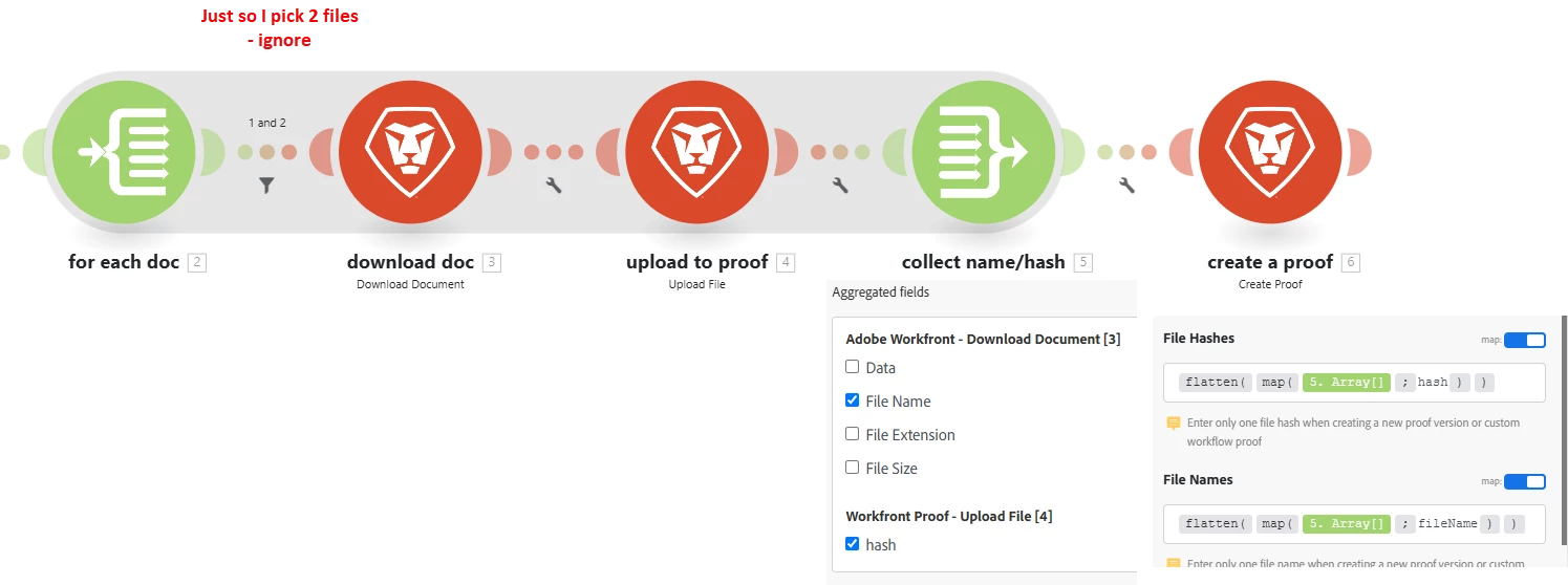 I'm working on a usecase where I need to create a single proof by mapping multiple documents and hash files. I'm using create proof module and it is working when I map hashes and file names by using add item but it fails when I map them by getting hash files in a variable. While mapping I'm using the format of hash1,hash2. Let me know if anyone knows how to fix this.