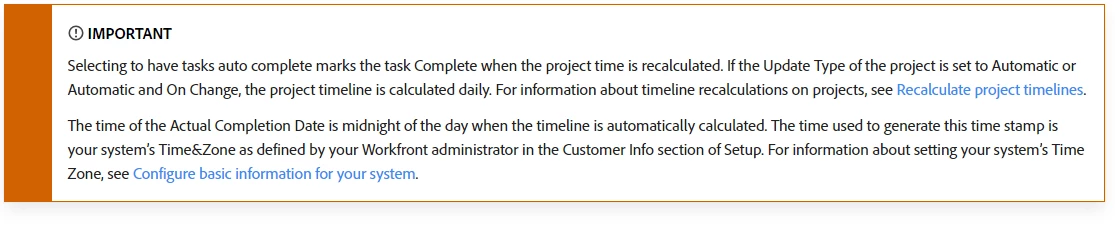 I'm changing some of the task's modes from "user must update" to "auto-complete." From what I understand, the tasks should complete at due date except if it has a predecessor which is incomplete. The tasks I'm using have no predecessors and a due date of last business day of month/ 5:00p.m. For some reason, I cannot get tasks to auto close no matter what I do.