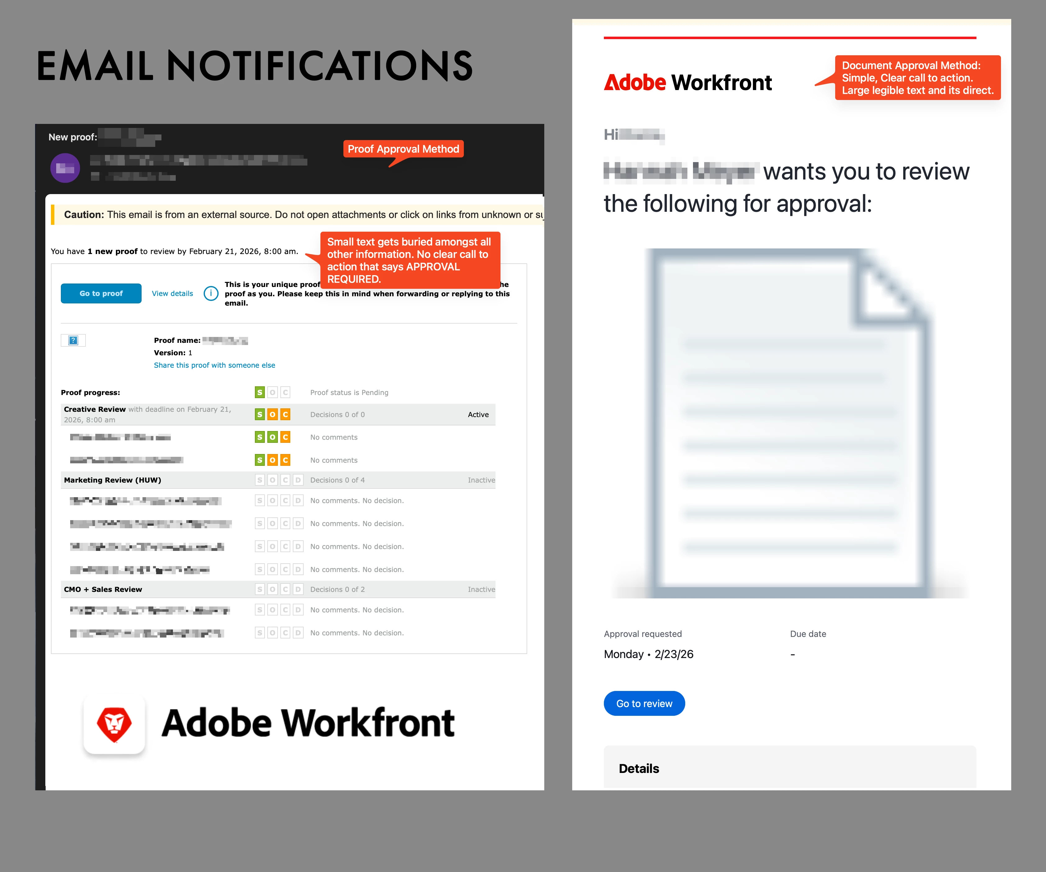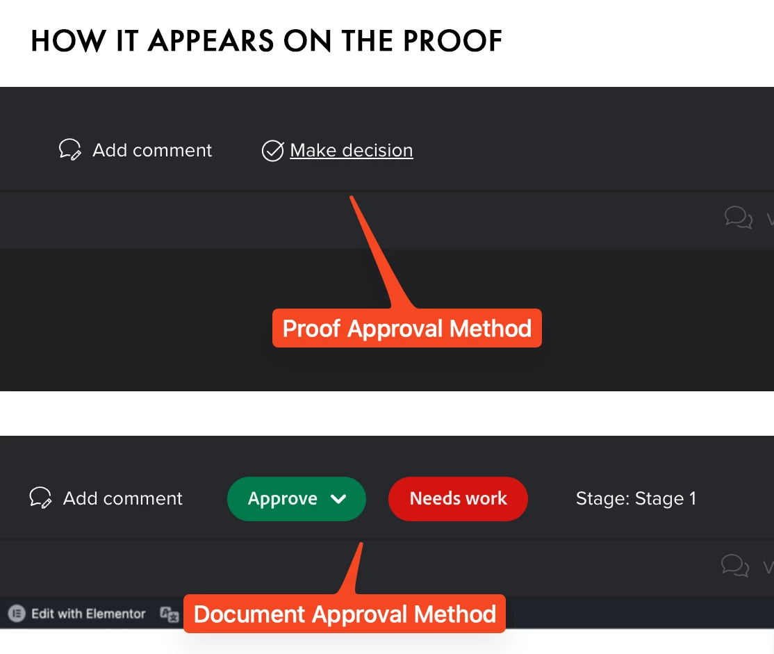 We often used the Document approvals for our proofs - was easier for us. But due to a certain issue/bug we’ve been somewhat forced to learn to do it via the Proof Approval method (via the ProofHQ way). I’ve noticed visually there’s a big difference and I much prefer how the Document approvals display. The red and green buttons for approvals let the users know right away where to click to make their decision. I am hoping the Proof Approvals can soon match the UI of the other approval method in the future. It feels cleaner and more direct on what the reviewers are supposed to do. Even the email notifications show a big difference. I wish there was a way to change the font size on the Proof notifications because any message sent has such a small font and immediately followed by the proof’s information that people start to just disregard after some time.