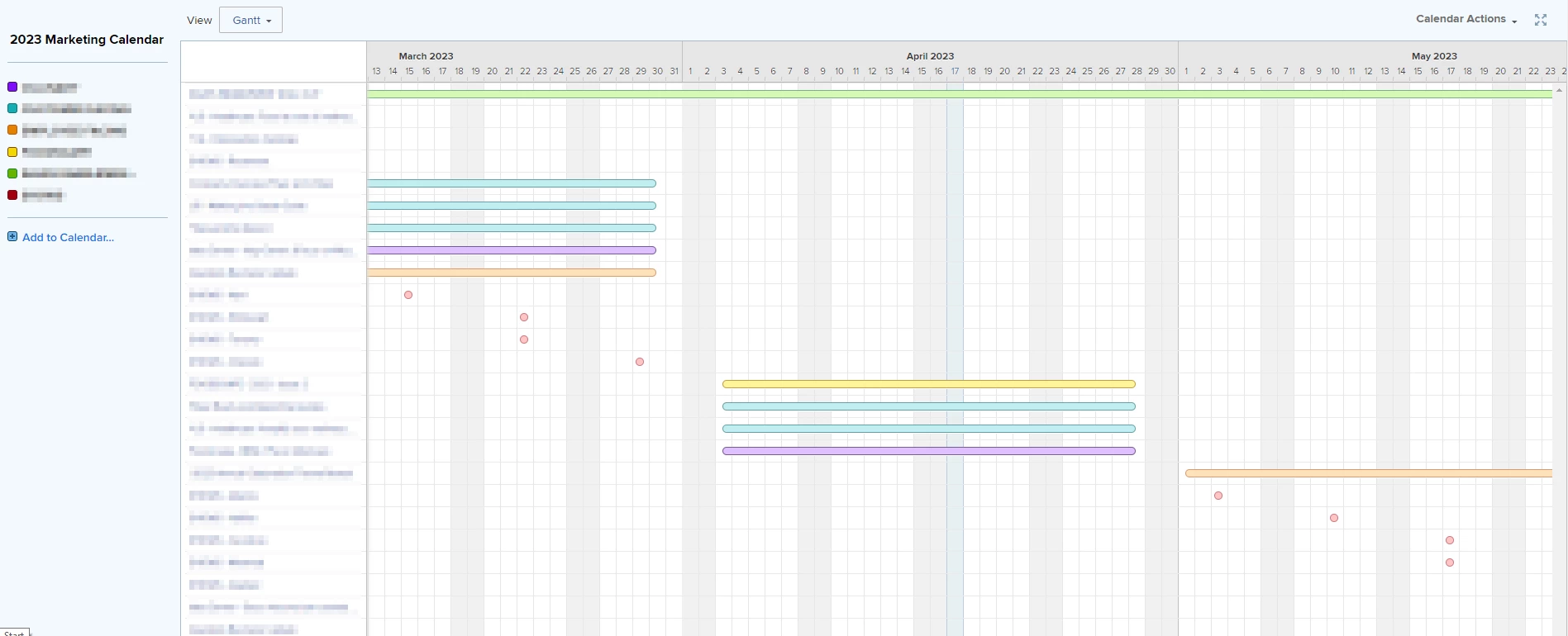Agree with Kurt, the calendars need an overhaul, but I created our Marketing Calendar and use the Gantt view. It's not great, but it's functional. Since you can't add programs (which we use for campaigns) to a calendar I created a project for each functional area, then a task for each campaign we planned for that area. This is only for a high level view of the year - I wouldn't want to do it for hundreds of campaigns. If Workfront adds the ability to add programs (and hopefully the separate campaign object that they were working on) to a calendar, then we could use our live projects and not have to create separate dummy projects for our Marketing Calendar.