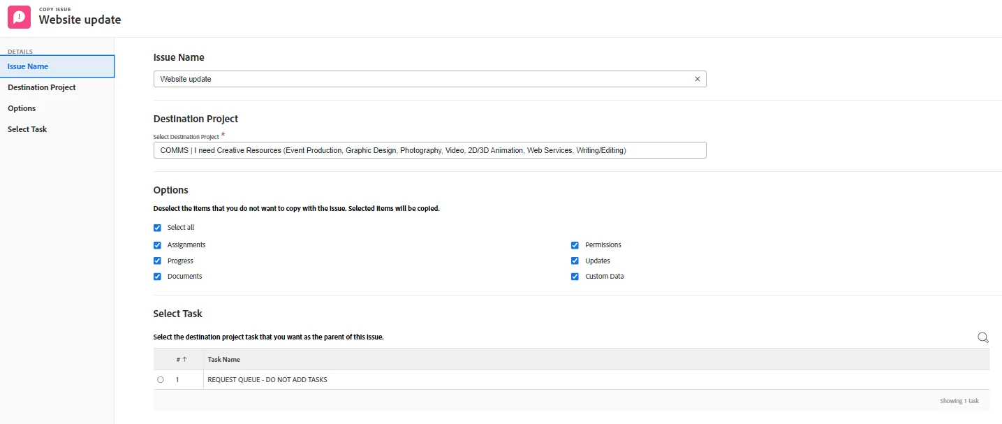Then I get this screen and select Copy Issue