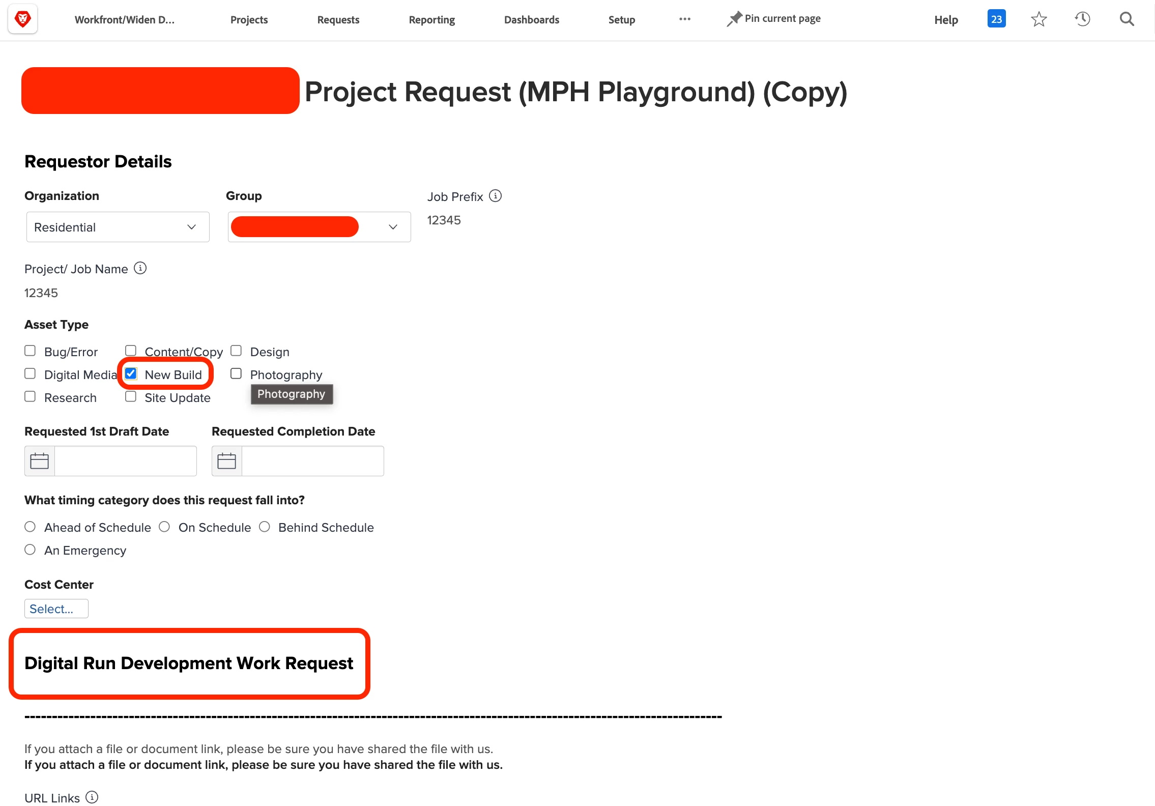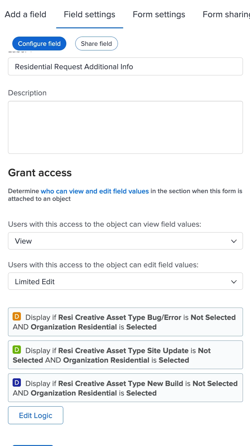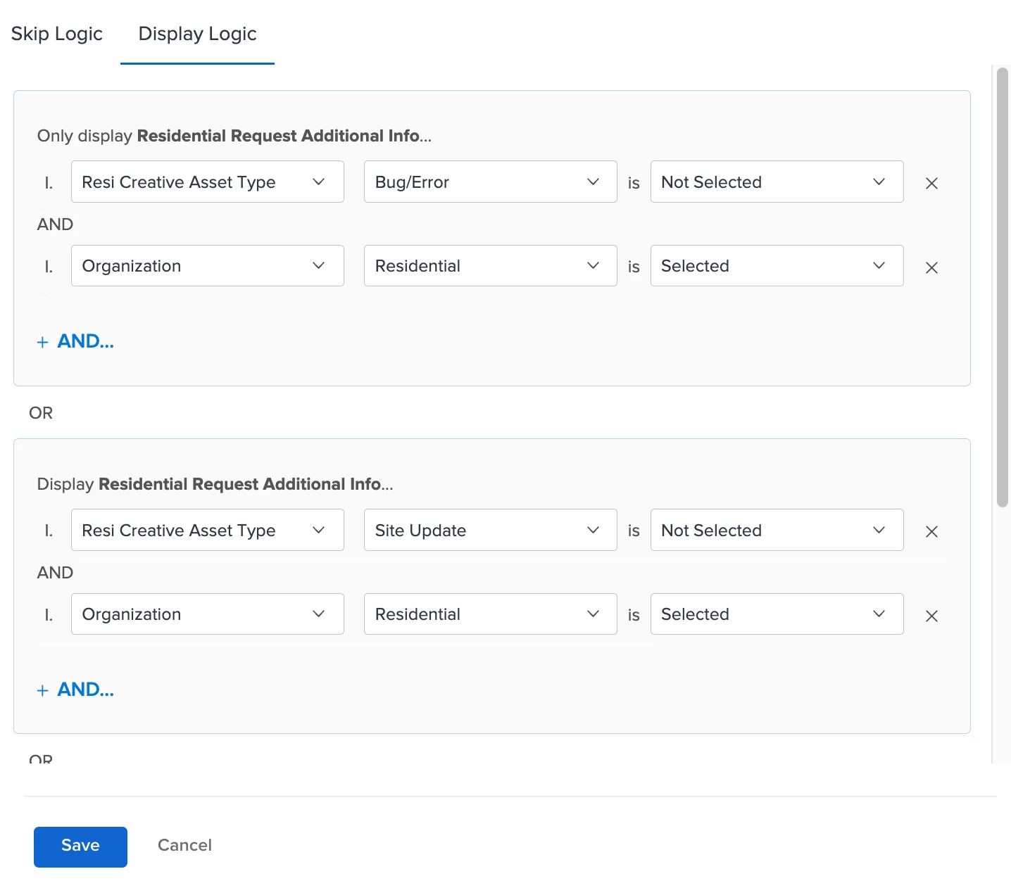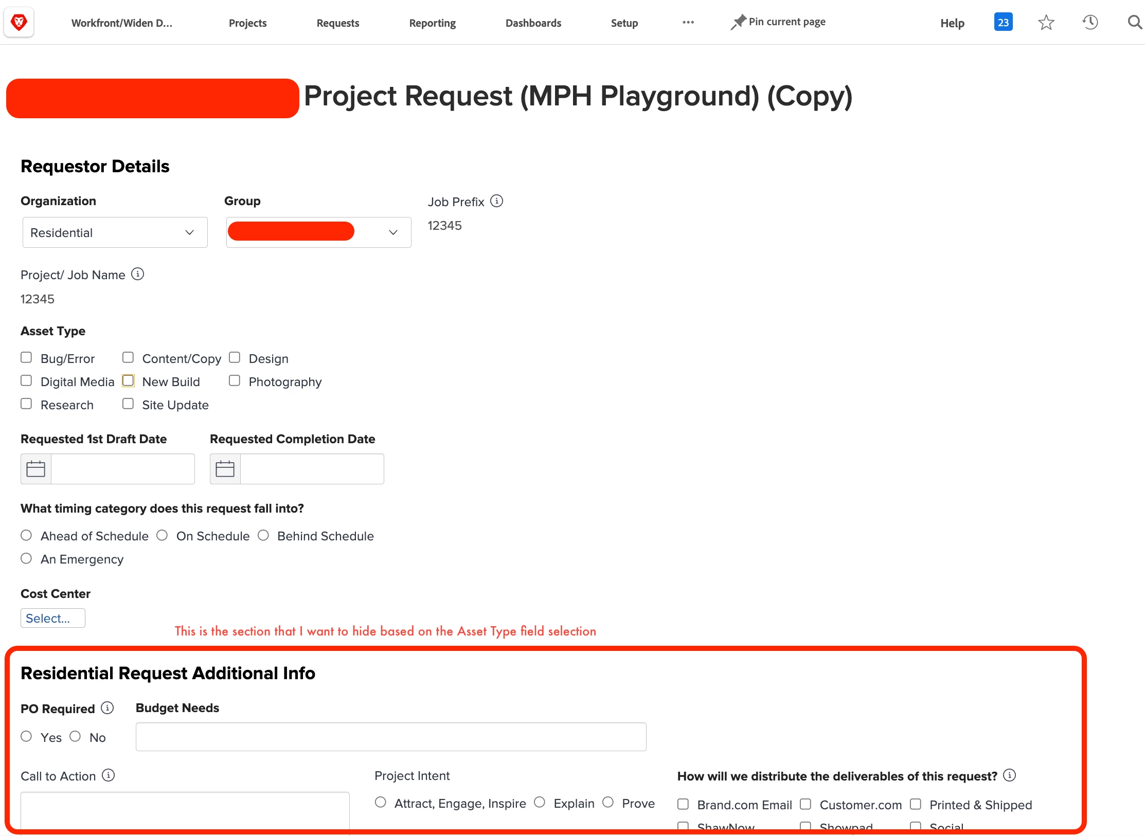 In the images included, if a user selects Residential in the Organization field and then either Bug/Error, New Build, or Site Update from the Asset Type field, I want the Resident Request Additional Info section and all fields to disappear.