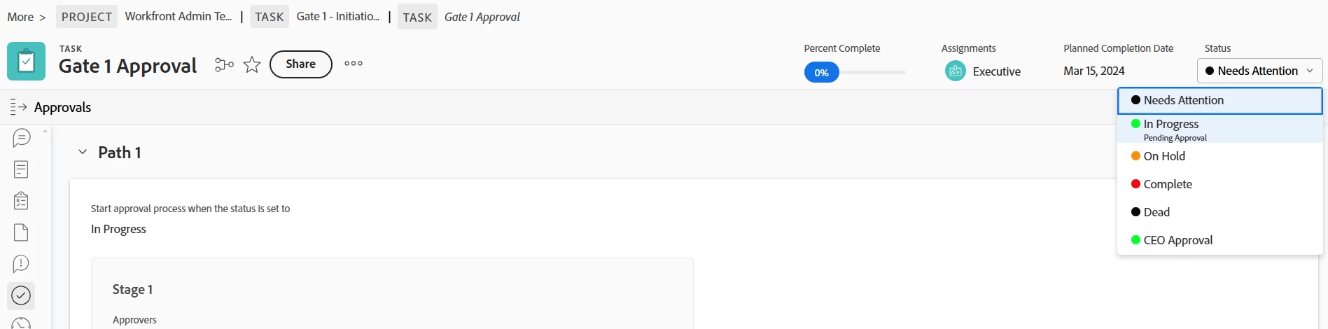 I'm curious to know how to best use Workfront for gate/approval workflows. We're currently using WF for our internal creative development and system is natively set up to support that type of workflow. I know how approvals work within documents and proofs, but I'm having a hard time visualizing how gates would work. We have an Adobe consultant and will be able to connect with them on this in the near future but in the meantime, wondering if anyone is willing to share screen shots of how they have set up.