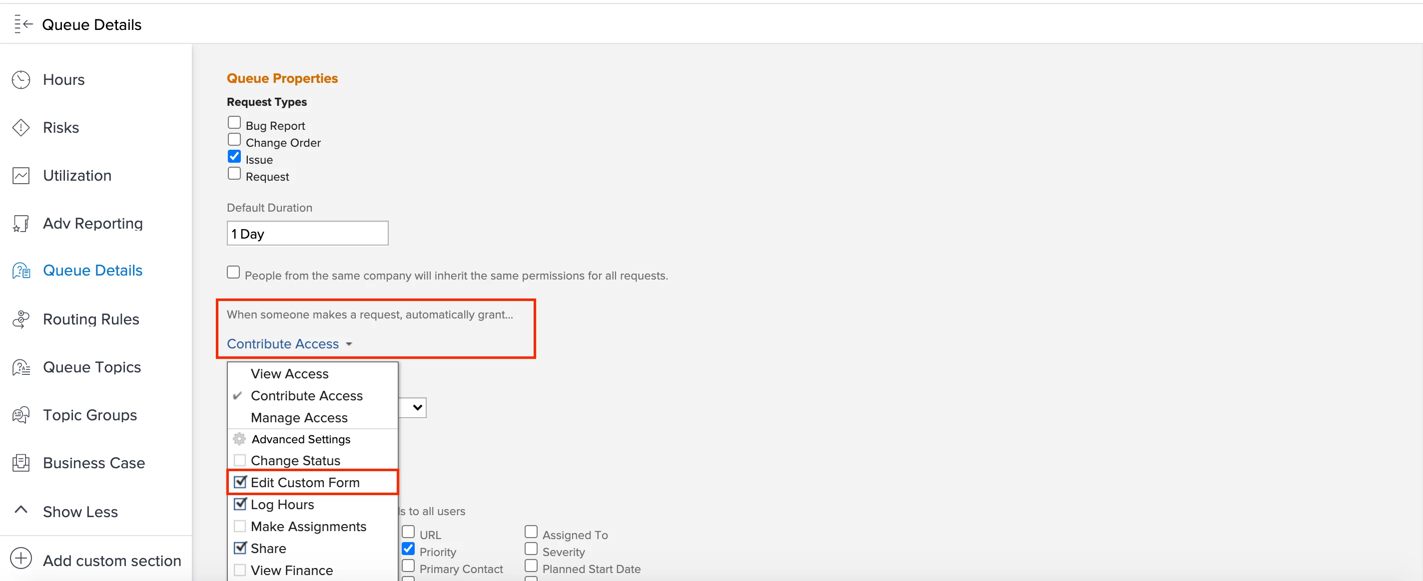 - If a custom form is attached to your request queue, in the Queue Details section, make sure that the line for “ When someone makes a request, automatically grant” is set to Contribute with Edit Custom Form selected from the Advanced Options menu.