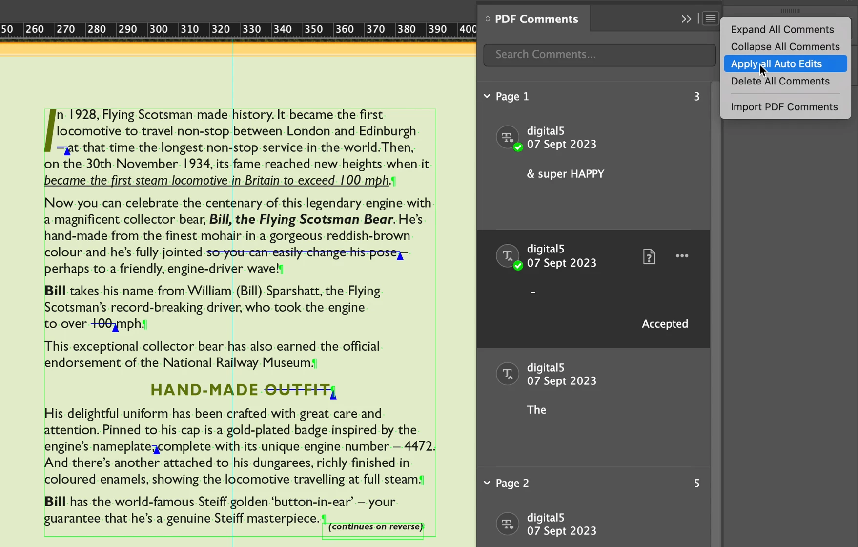 In the comment importer it will show all the comments made on the pdf proof and more importantly to me, on text amends you can simply accept/approve each or all and InDesign will automatically do all the text amends.