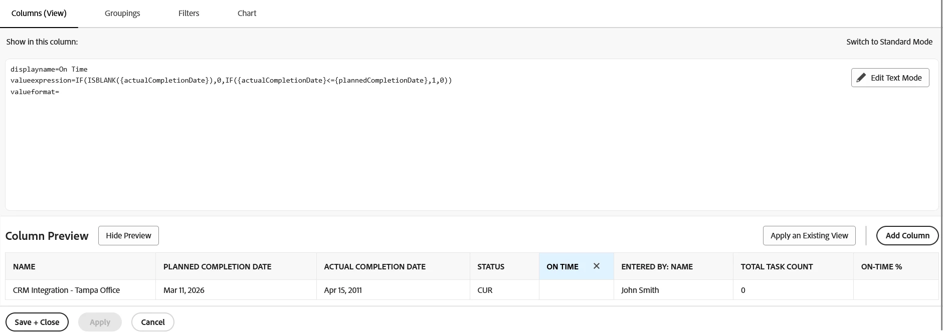 I am trying to calculate On-Time Delivery % in Adobe Workfront using a Project report, but the percentage column is not returning any values.