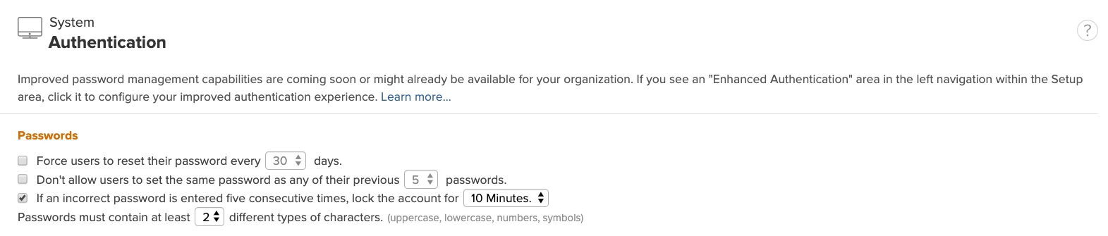 NOTE: These settings do not apply if your organization uses single sign on (SSO).