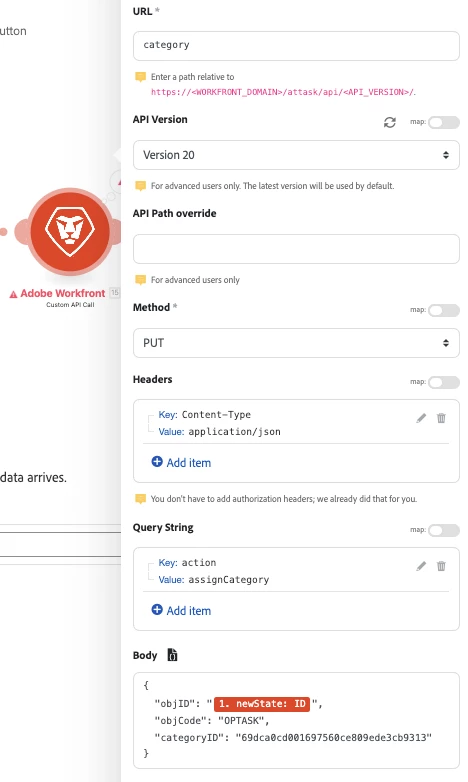 And I also tried using a Custom API Call as such