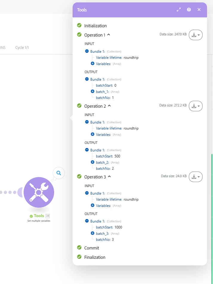 2. setVar calculate the batches - you can go up to 2000 records or anything smaller