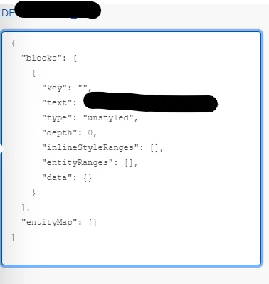 { "blocks": [ { "key": "", "text": "Some Text", "type": "unstyled", "depth": 0, "inlineStyleRanges": [], "entityRanges": [], "data": {} } ], "entityMap": {} }