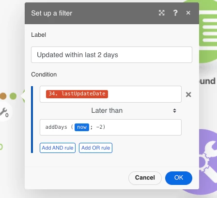 Hi. What would be the syntax in Fusion when I want to retrieve and object only if it was last updated within the last 48 hours or 2 days: