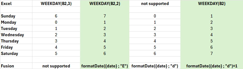 you need to check on the format of weekDay - Fusion has 2, Excel has 10 formats.