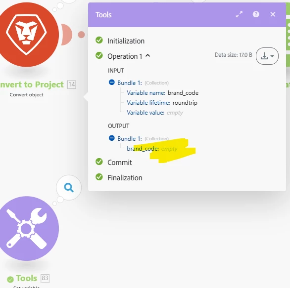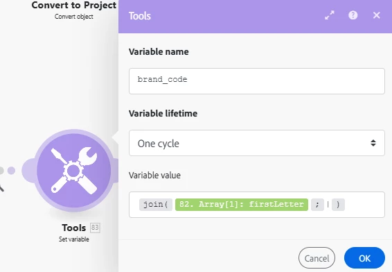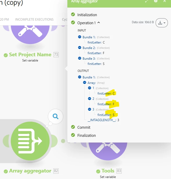 Hi there, the output of an aggregator (module #82), I am getting as an array with values C, F and S as you can refer in the screenshot. Now in the next module #83, I need to concat them as "CFS" (preferably without any separators). I am using join function, but its not working. Please help!