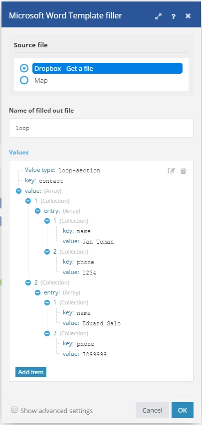 When using loops, you can choose to employ either the Fill out a document module or the Fill a document with a batch of data aggregator module.