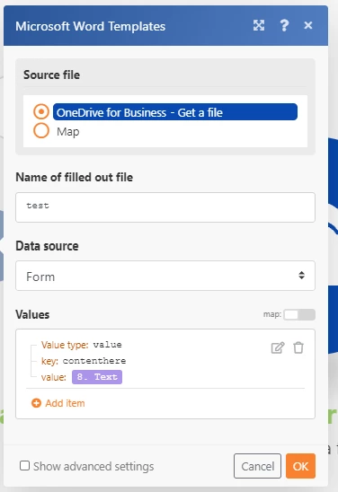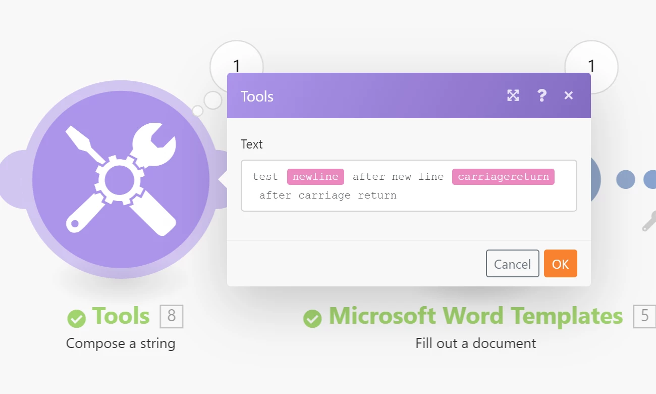1. Please try to compose a string and then add to the "Fill out a document" module. In this example I used the "Compose a string" module to create a bundle with my desired output: