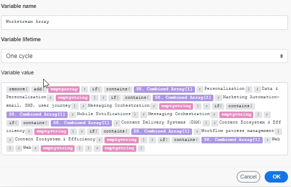 I know we're dealing with an array because we're dealing with a multiselect, so I try iterating out all the choices. Then, I set a variable using an IF statement...