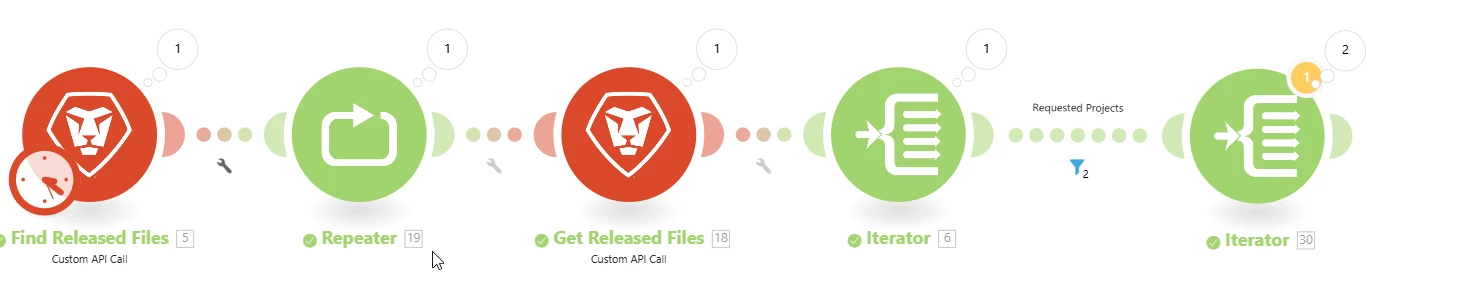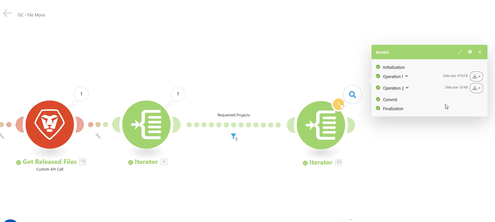 I am looking for a way to download files from multiple projects and to copy those files to a new project. My Custom API call/filters successfully work to pull the correct files into the bundles but what I am having trouble with is how to handle the bundles/operations after the API call. After filtering my iterator I am left with multiple Operations when I only need one(?)