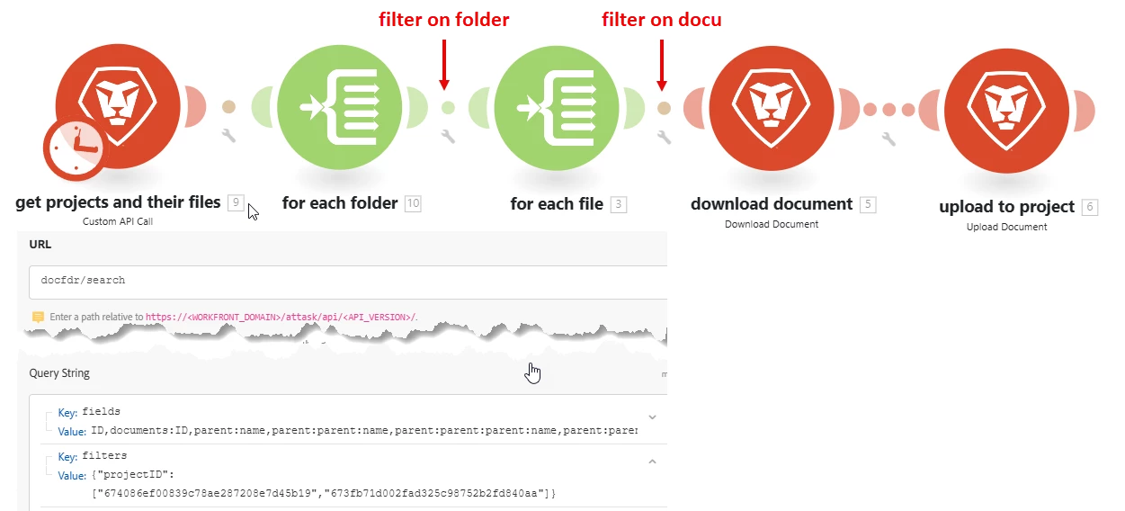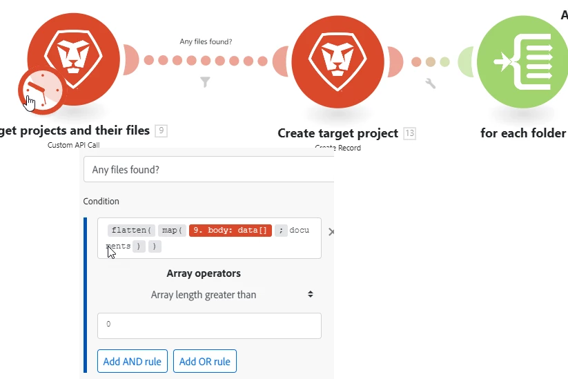 How can I move this scenario along so that I only get one resulting project with the Create A Record module. Also, how can I move all of the files I called on with the API to copy to the newly created project?