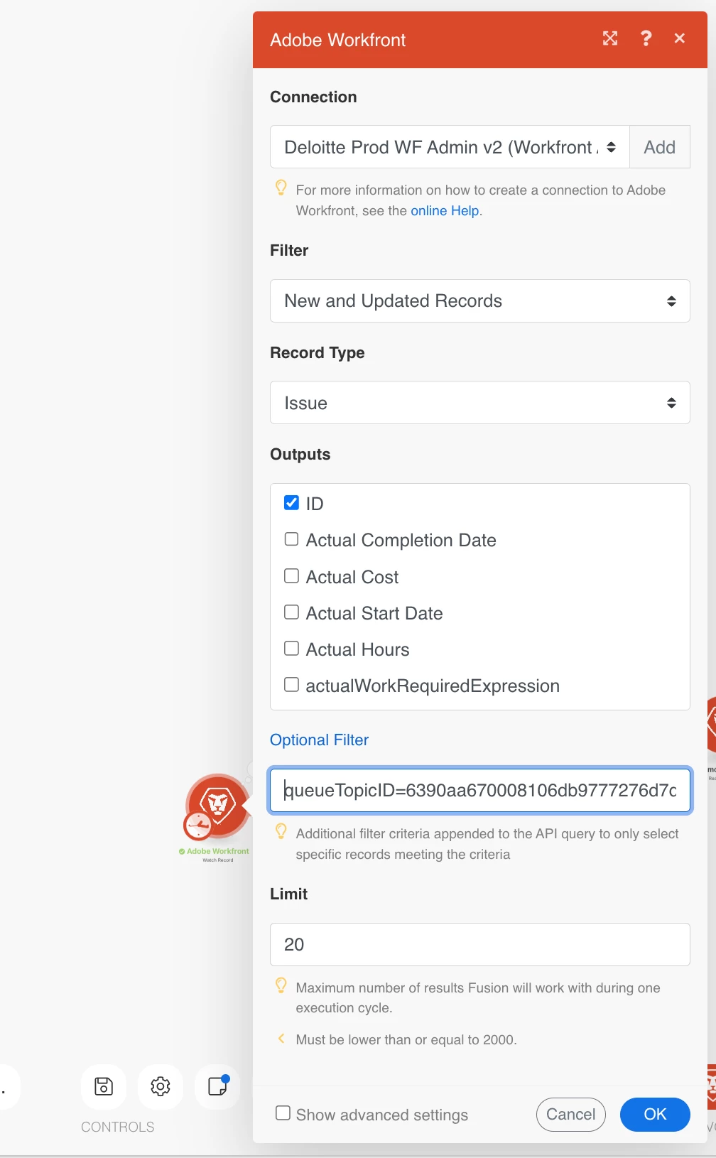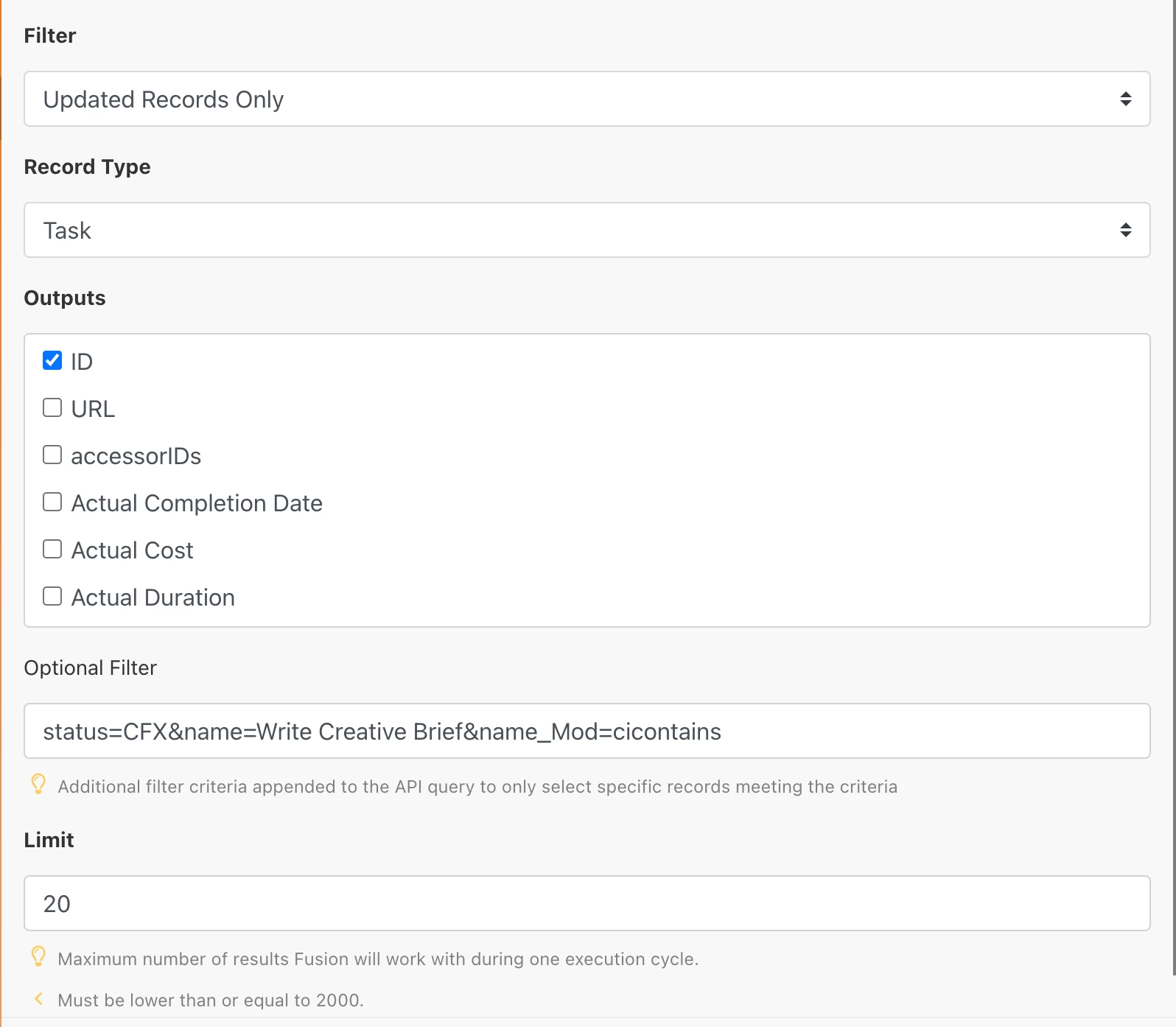 I'm watching for a status on a task but the task name needs to be part of the filter too. I can do 'status=CFX' and I can do name='Write creative brief' but how do I include both of these in the one 'Optional Filter' field in the module properties? I've tried AND and also nothing because the Fusion help says AND is the default anyway. I could put a filter on the route to the next module but it would be neater if I could include both criteria on the 'Optional Filter'. Thanks v much
