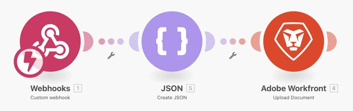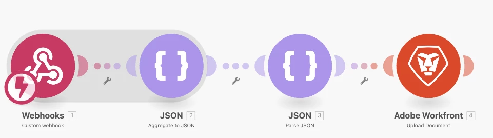 I have created a custom webhook, which should receive a pdf file and pass it to the Workfront module "Upload document".