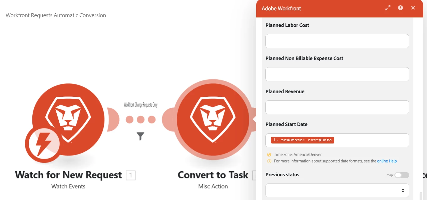 I'm currently building some scenarios for my company's Workfront instance and I would like to use Fusion to set the Planned Start Date to the Entry Date of the request.