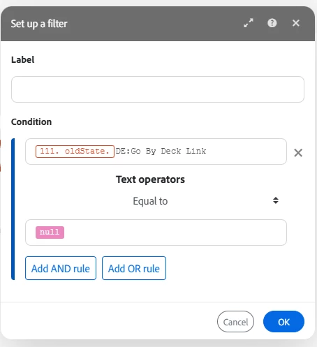 I am trying to run a scenario that will trigger when a custom field is edited. The issue I am having is configuring a filter based on the oldState value being blank. Meaning if the field changes, but data existed in the field prior to the change, the scenario will not proceed.