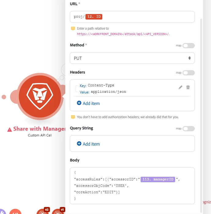 I have a PUT Custom API module that shares a project with a user's manager once an issue is converted in the scenario.