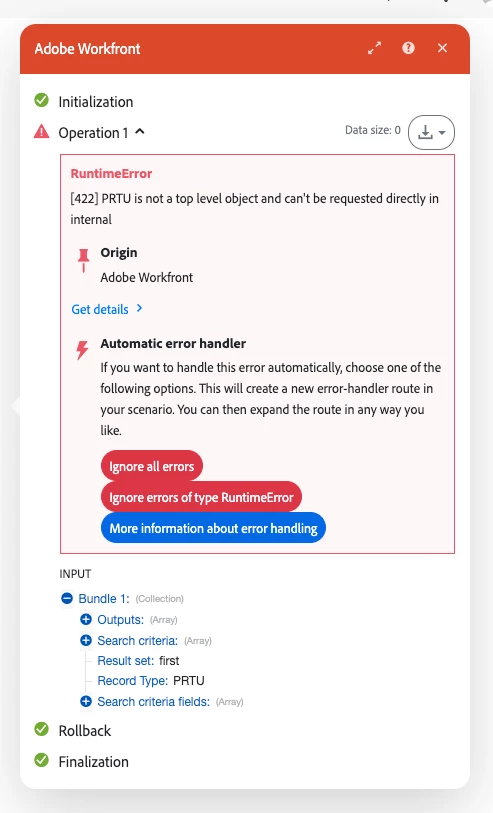 '[422] PRTU is not a top level object and can't be requested directly in internal'