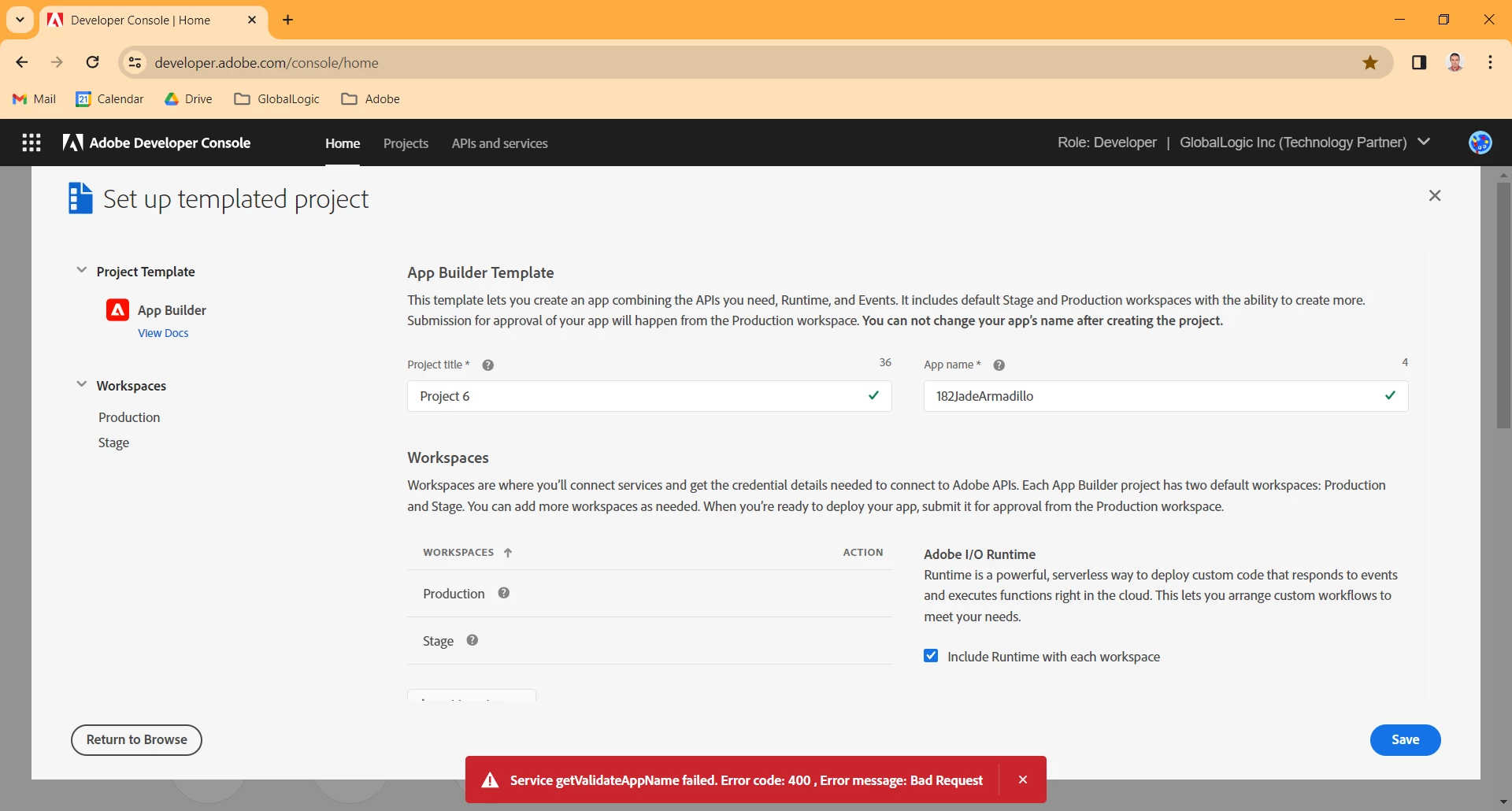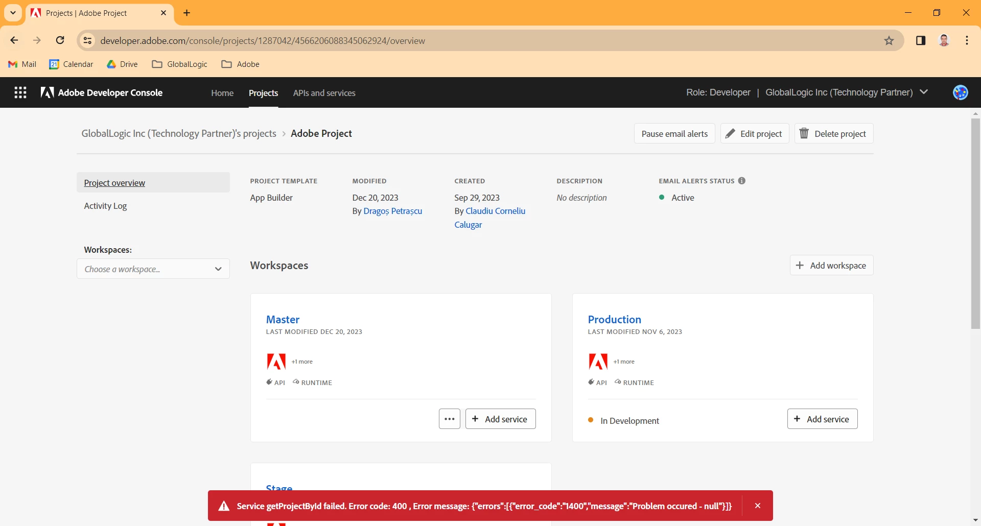 I hope this message finds you well. We've been encountering blocking errors (Service getProjectById failed. Error code: 400 , Error message: {"errors":[{"error_code":"1400","message":"Problem occured - null"}]}) in the Adobe Developer Console since last week. Specifically, we are unable to add new Adobe App Builder projects, and adding new workspaces to existing projects is also not possible. Attached are screenshots for your reference. Could you please assist us with resolving this issue?