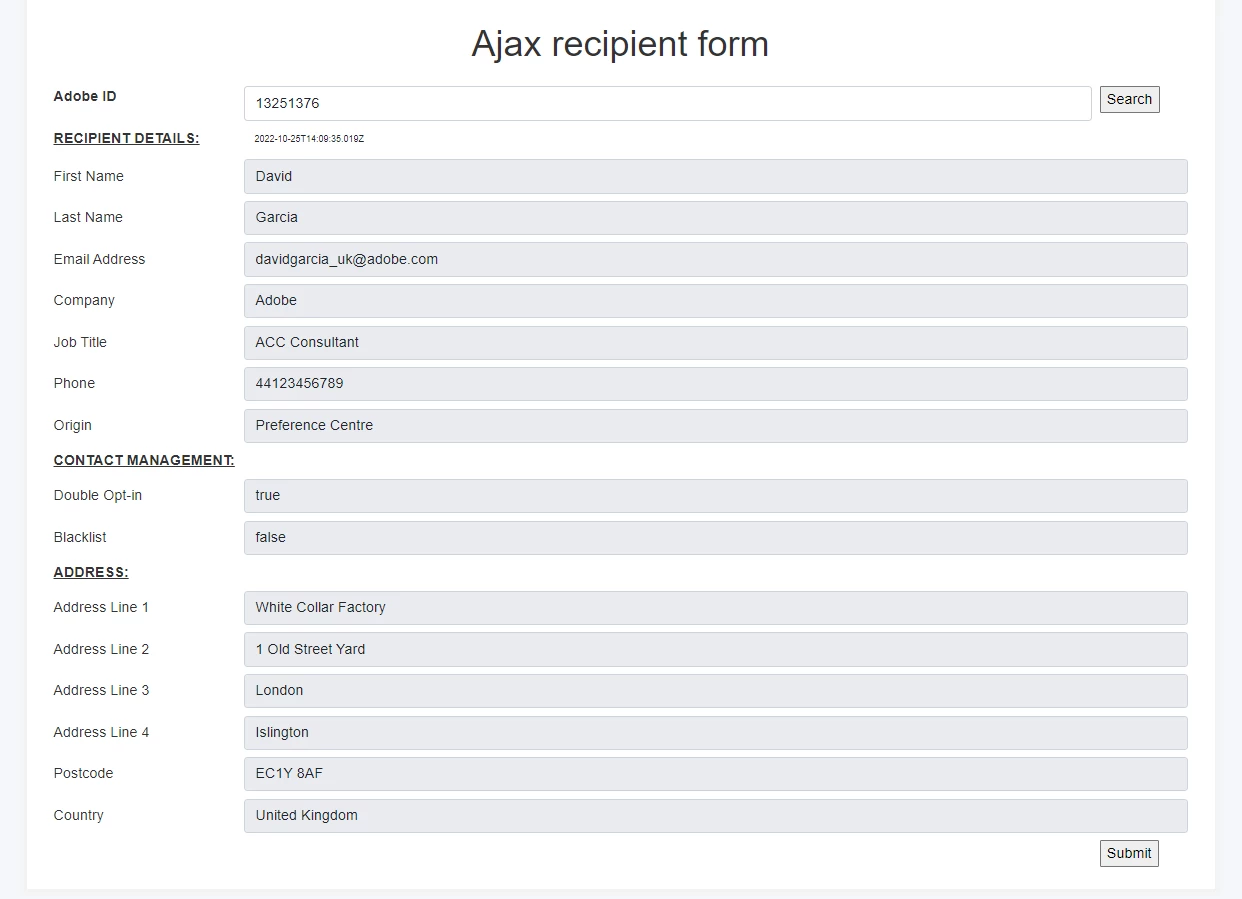 - Start by typing in the search box the ID of the adobe campaign recipient record you would like to load into the webapp form.