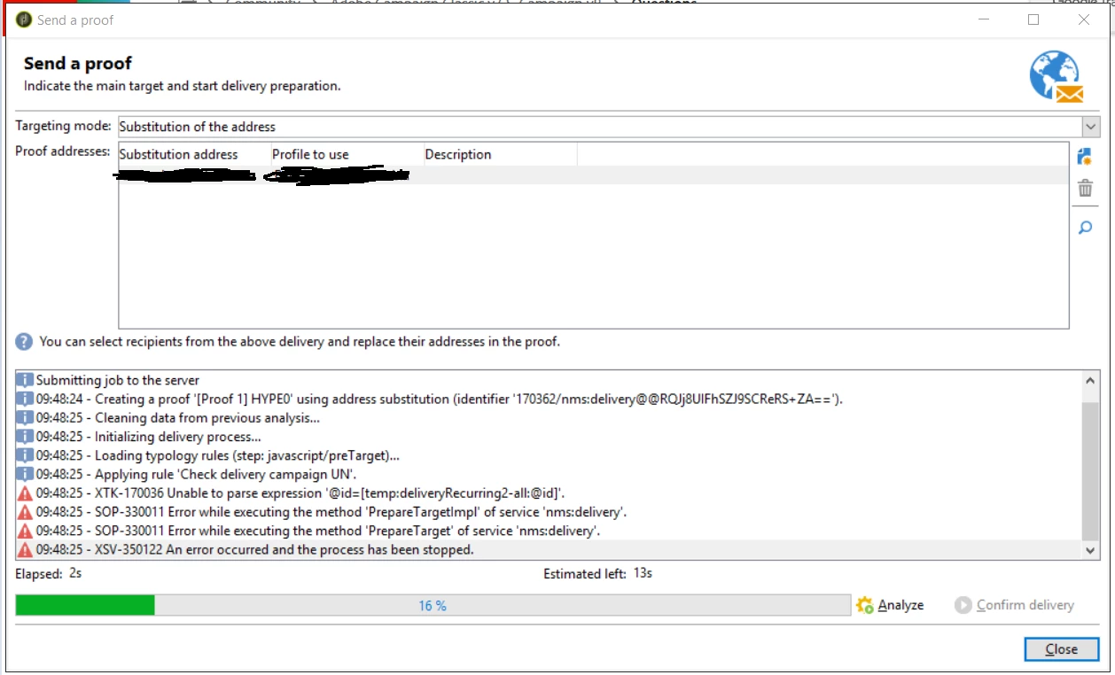 Hello, I have a Campaign delivery in 'Confirmation pending' state, I want to send a proof with substitution of the address, but when I Analyze a get this error: