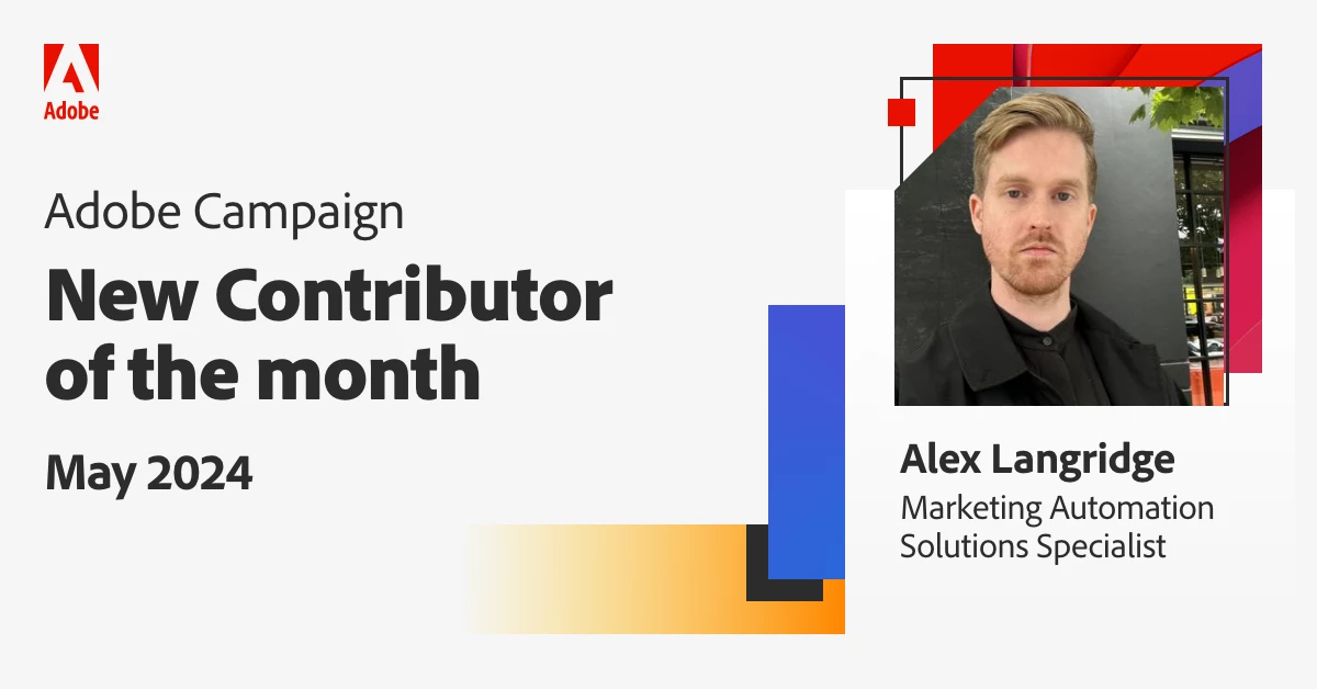 Please join me in congratulating our Adobe Campaign Community member, Alex Langridge, aka @alangridgefor being recognized as the Adobe Campaign Community's New Contributor of the Month - May 2024.