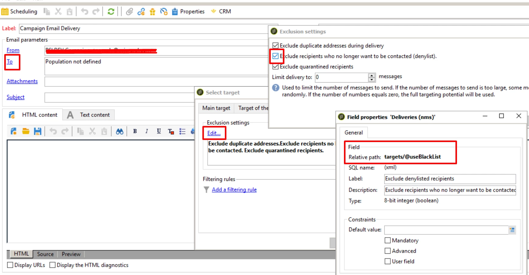 • Under the "Delivery" section, look for the "Exclude denylisted addresses" checkbox (this corresponds to targets/@useBlackList).