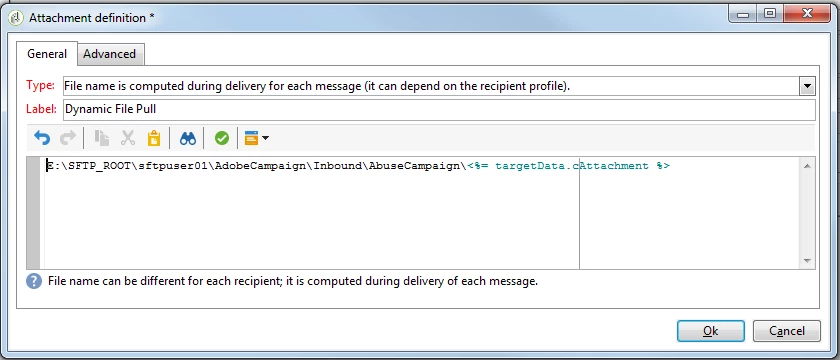 - Specified the access path of the file and its personalized name in the definition window (based on the customer name, it picks the respective file to attach).