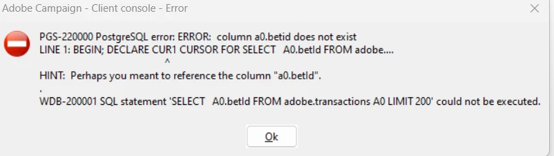'SELECT A0.betId FROM adobe.transactions A0 LIMIT 200' could not be executed.