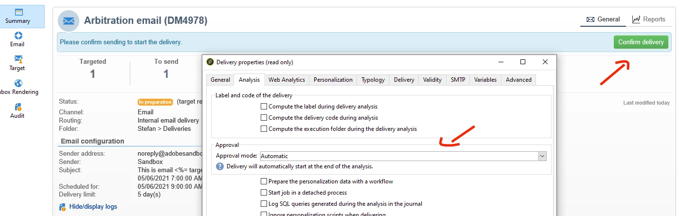 Contact date and extraction date are +12h and the deliveries are left on "Estimate Target" in order to have the re-evaluation being applied. No approvals on the Campaign and the schedule on the delivery template is set to "Automated", so no approvals should apply.