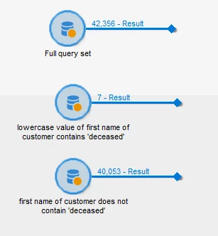As you can see below, the full data set is 42,356 records. A query of lowercase(first name) that contains the text string "deceased" returns 7 records (this is correct). However, if we apply the query in the opposite fashion it returns 40,053 records. There was an extra 2,296 records it was excluding from the result set. It turns out that these extra records were blank first names.