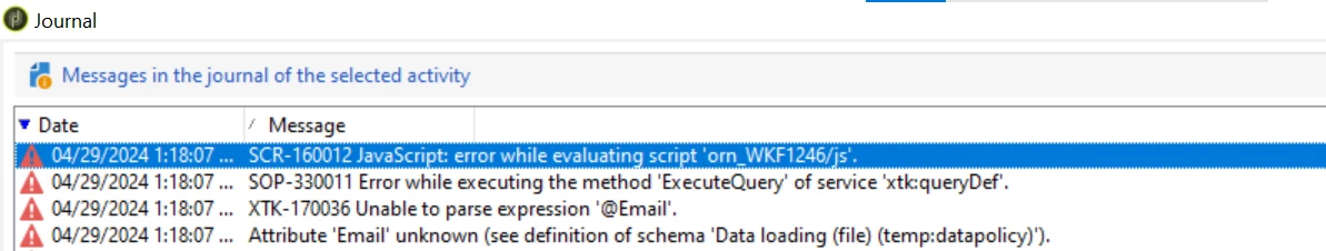 I'm facing an error in JavaScript activity while attempting to remove invalid email addresses from the data loading activity.