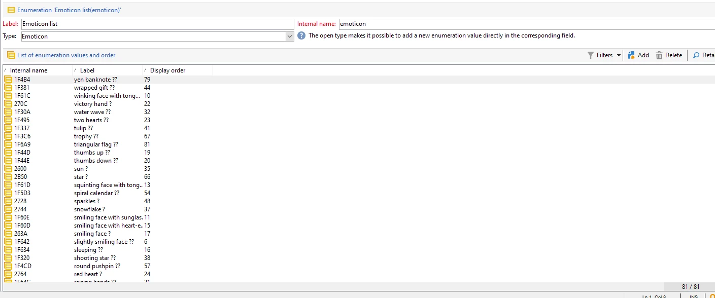 I see that we have possibility to insert emoticons in emails and sms but when looking into the enum list I see as below: