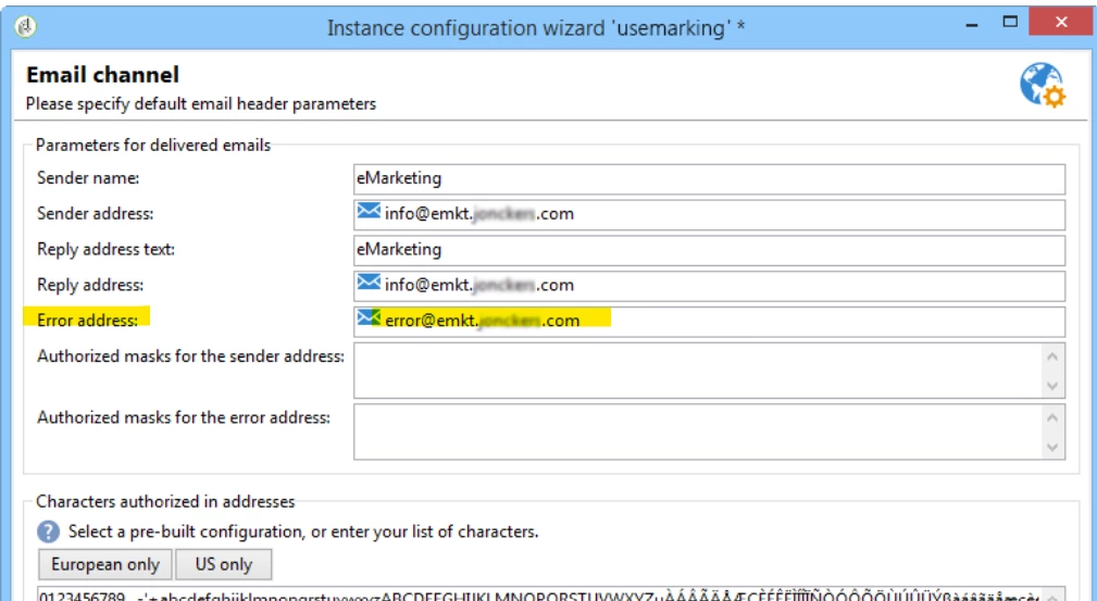 Error Address configuration will be used to handle bounce mail and enter the configured email address of messages with errors. If any technical issues occur due to handle bounce mail(while sending the bounce emails if any technical issues occur, then the message will go from this error address configured email), including emails received by the Adobe Campaign server due to non-existent target addresses (if the email Address is empty and the error message comes to Adobe Server then it default comes from this error email configuration).