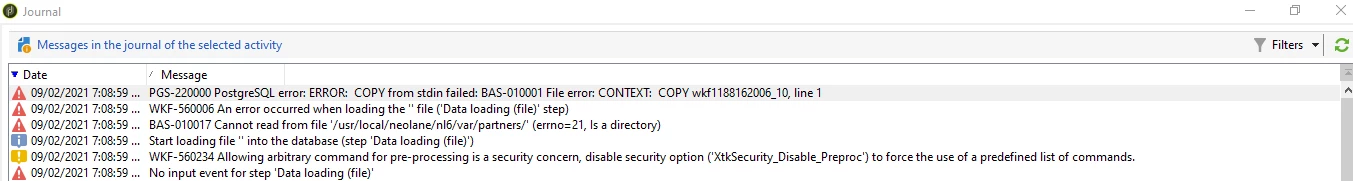 I had got error message while I am executing the Data loading (file) through an workflow. Tried changing various parameters like Name of the file to load to Pre-process the file and added <%= vars.filename %> but I had found no positive result. The error is shown as follows.