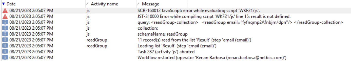 After this code, I will need to update that list with an List Update activity, but I am getting this message error while executing the JavaScript activity: