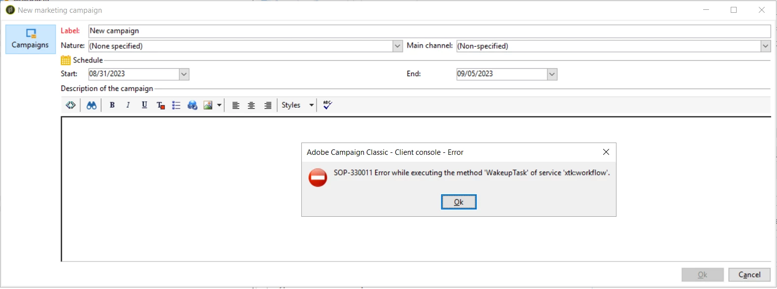 Error while executing the method 'WakeupTask' of service 'xtk:workflow'