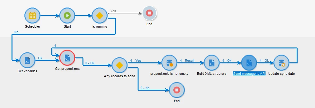 After the javascript retrieval I am populating temporary tables with the data, and then read those tables later in the workflow to build the object being sent to the API. I don't want to send too big requests to the API, therefore I have chosen to loop through the records, until none is left to process. I run this workflow every 30 minutes with a scheduler.