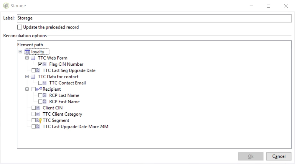 What am I looking for, when the customer check the checkbox for the condition and click on the confirmation button, is to store the first data (308406*** call "cinNumber") in some kind of list so I can use it in a workflow later to make an exclusion.