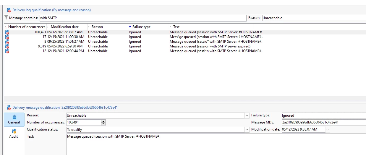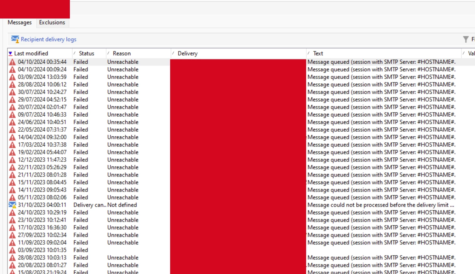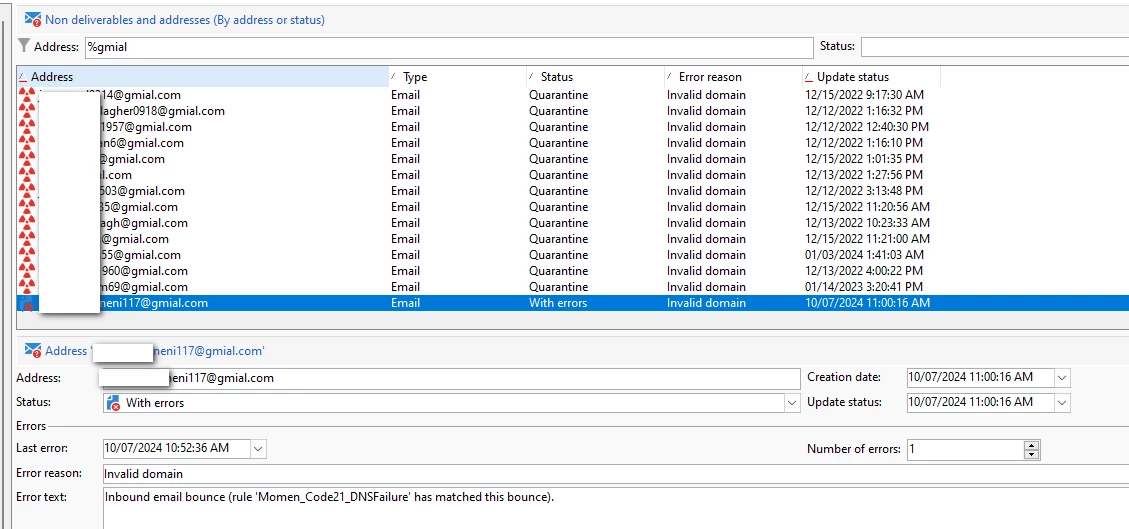 Hello I'm noticing many service / transactional email addresses we receive with typos (eg gmial.com, homtail.com etc) are not entering the quarantine table as expected. Please see example recipient delivery log of a customer with domain hotmaill.com: