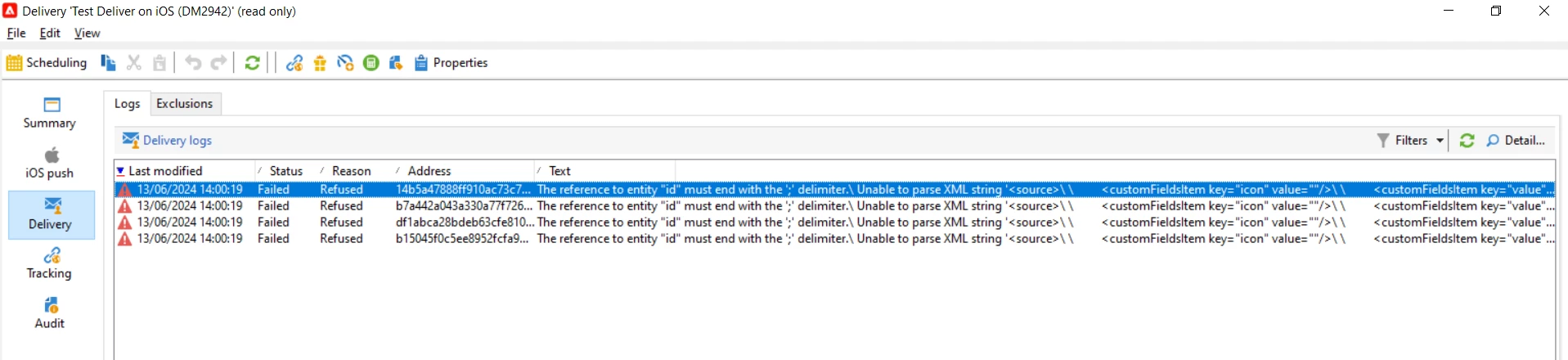 The reference to entity "id" must end with the ';' delimiter.\ Unable to parse XML string '<source>\ \ <customFieldsItem key="icon" value=""/>\ \ <customFieldsItem key="value" value="https://abcdefpsit-#DOMAIN#.net/?page=abc&id=889&model=Model%#ID#%20kl60s&title=Model%#ID#%20kl"/>\ \ <customFieldsItem key="type" value="Deeplinking"/>\ \ <customFieldsItem key="cta" value="Link"/>\ \ <customFieldsItem key="title" value="Good Life Deep link"/>\ \ <cus