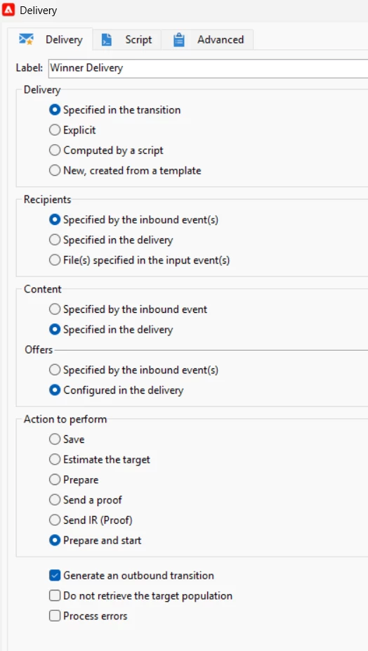We are performing A/B testing on a pair of deliveries and trying to generate a winner delivery for the remaining population after a wait period for feedback. We have followed along with the solution in other Experience League posts, and can generate the delivery within the JS code activity as a copy of the winning test delivery via Duplicate(), post winner decision.
