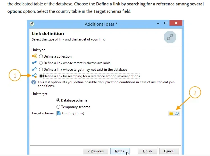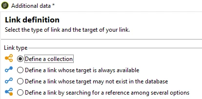 Define a link by searching for a reference among several options: this type of link defines a reconciliation towards a unique record. Adobe Campaign creates a link to a target table by adding a foreign key in the target table for storing a reference to the unique record. Example of this type link is explained in detail in this document.