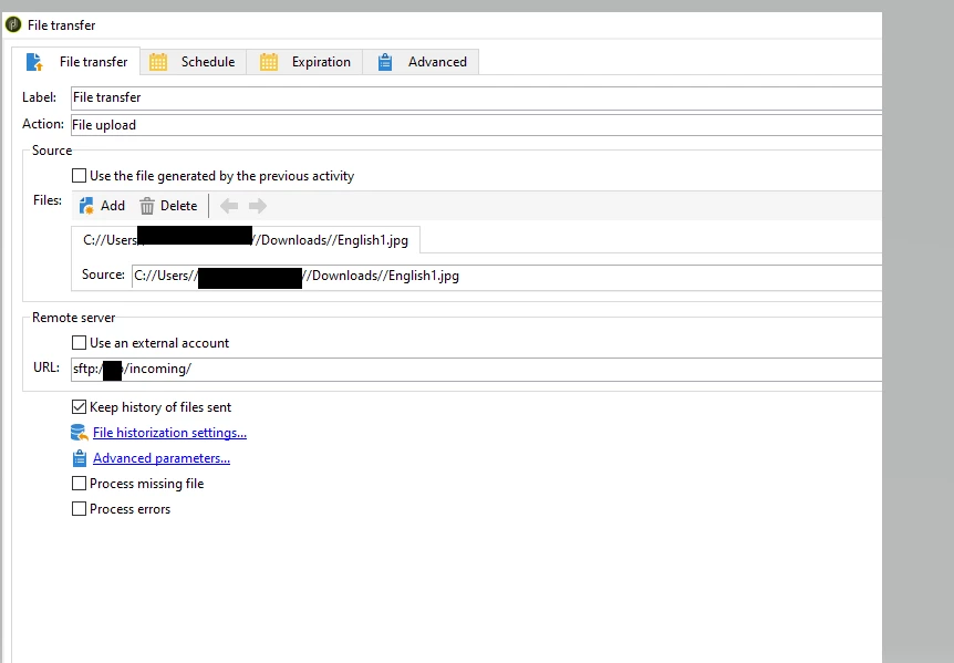 I am testing to do via a js code , the issue is the JS is running on the server hence cannot browse my local disk.I thought of using a file transfer activity to upload the images from my local disk to adobe classic ,I got blocked by this error saying that no file found to transfer, here how did I set the activity , fot the url I used sftp:/clientName/incoming/.I got this error on the log.